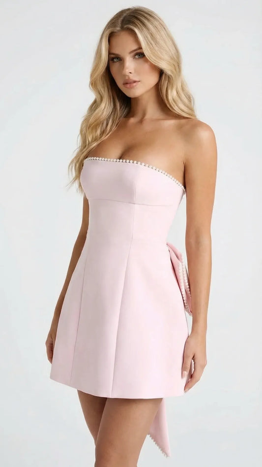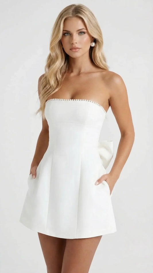 Women's Strapless Pearl Trim Bow Cocktail Mini Dress